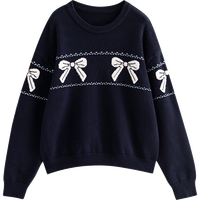 初语毛衣女2025冬季新款蝴蝶结提花复古减龄圆领微宽松保暖上衣 藏青色 S