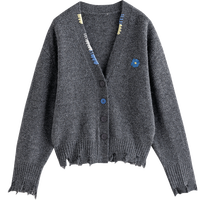 初语开衫外套女2025冬季新款V领撞色绿绒蒿复古不规则毛边针织衫 花灰色 S