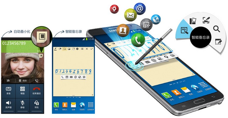 GALAXY Note3的智能备忘录,能将您的笔迹直接连至7个常用的功能指令:通话、保存联系人信息、发信息、发邮件、搜索网页、地图搜索位置和添加任务。只需手写便条,即可为您执行相应指令,或是将您的手写信息转化为格式化的内容。当您记下某个目的地的名称,就能立即进入地图并找到相应位置;当您手写一个电话号码,就能直接转入通话或存储功能。