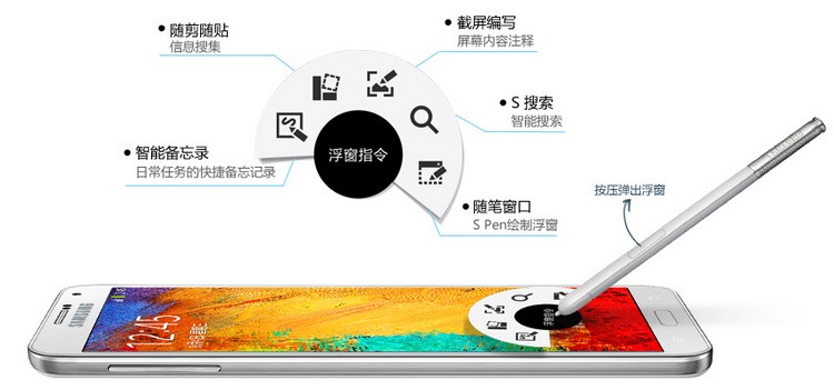 GALAXY Note3的S Pen浮窗指令宛如神奇的魔法,助您瞬间完成各项指令。您只需将S Pen悬浮于手机屏幕上方的任何位置,轻点笔杆的按钮,屏幕上就会自动弹出S Pen浮窗指令的5个常用的强大功能:智能备忘录、随剪随贴、截屏编写、S搜索和随笔窗口。S Pen浮窗指令可随时开启,省去了反复切换屏幕的麻烦,让您的任务处理更加轻松便捷