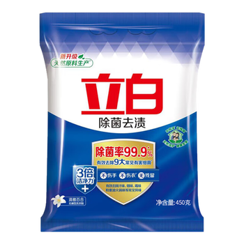 立白除菌去渍洗衣粉,专为校服净家用设计,具有99.9%除菌率和3倍洁净效果。450g装方便携带使用,清除污渍、异味,并保持衣物清新香气。
