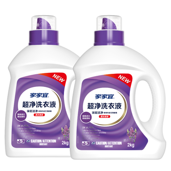 商品介绍:家家宜薰衣草香洁净除菌洗衣液促销装,每瓶2kg*2瓶。适用于手洗和机洗,清洁、漂白并持久留香。