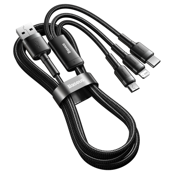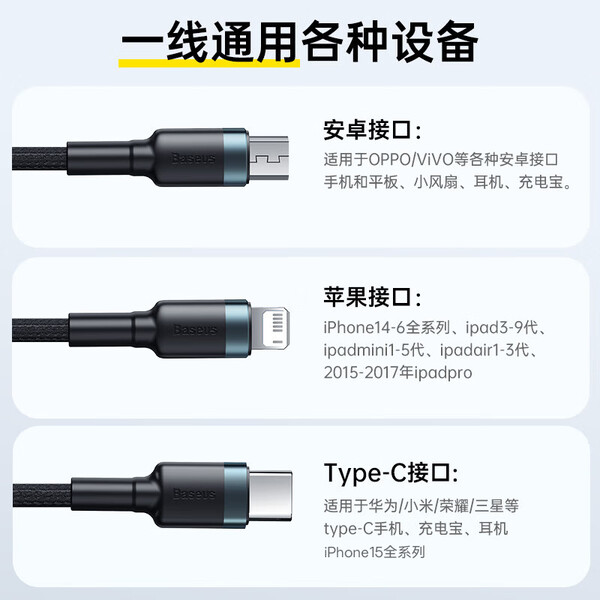 倍思数据线三合一充电线器一拖三快充三头适用多头车载苹果Typec充手机车超级车用汽车USB伸缩多功能多用电器