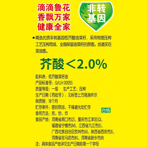 鲁花【直销】低芥酸特香菜籽油900ml 非转基因 粮油 食用油