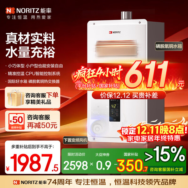 华帝(VATTI)官方补贴15% 燃气热水器 气电双断防护 水伺服级恒温强排 即热式热水器 防燃气泄漏保护i12103 13L 【一厨两卫】天然气