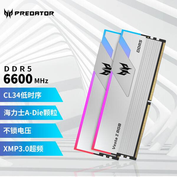 宏碁掠夺者(PREDATOR)32G(16G×2)套装 DDR5 6600频率 台式机内存条 Vesta II 炫光星舰RGB灯条(C34)星光银 AI电脑配件