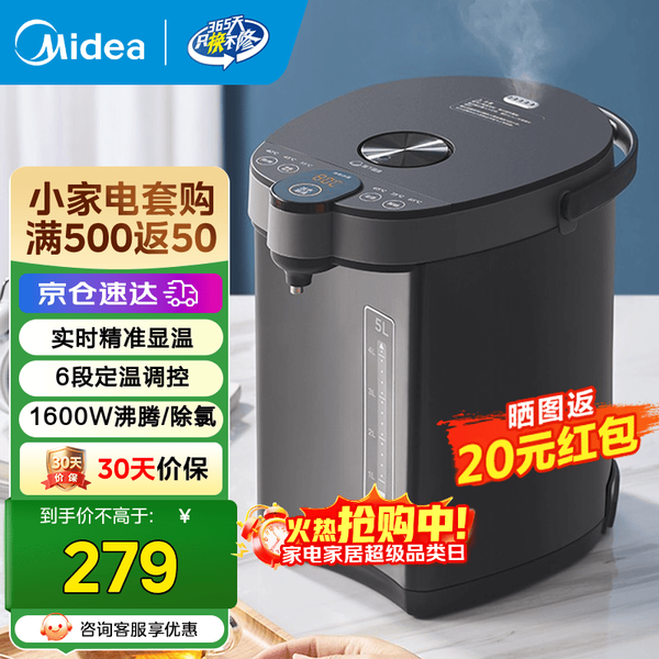 美的(Midea) 电热水瓶 5L升大容量保温除氯电水瓶 家用烧水壶保温一体全自动恒温电热水壶 开水壶 5L 【304食品级材质内胆】