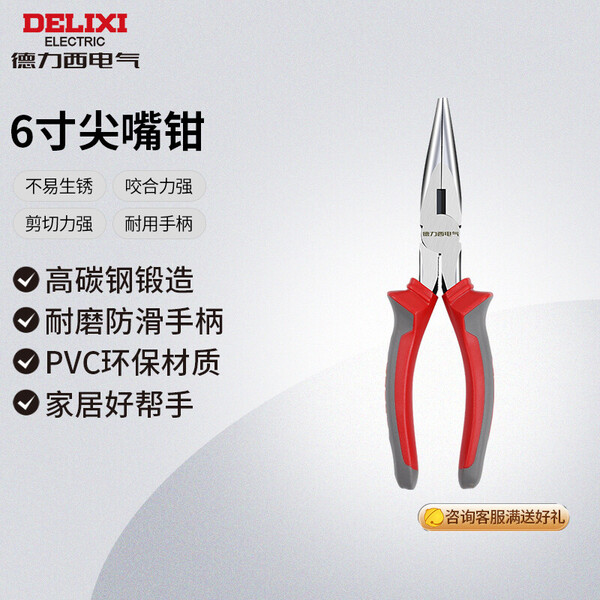 德力西电气多功能电工尖嘴钳,6寸,160mm,碳钢材质,夹持、剥线、剪线、压端子、除毛刺,皆可搞定。总长205mm。