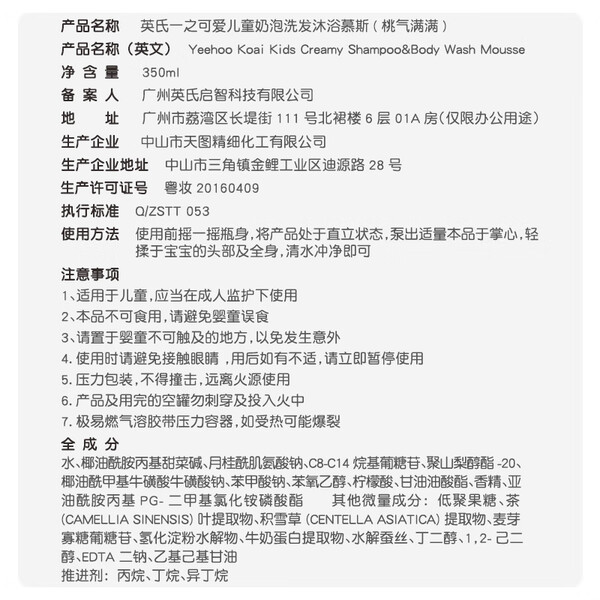 英氏儿童沐浴露洗发二合一婴儿沐浴露洗发水慕斯小奶泡350ml【拍2划算