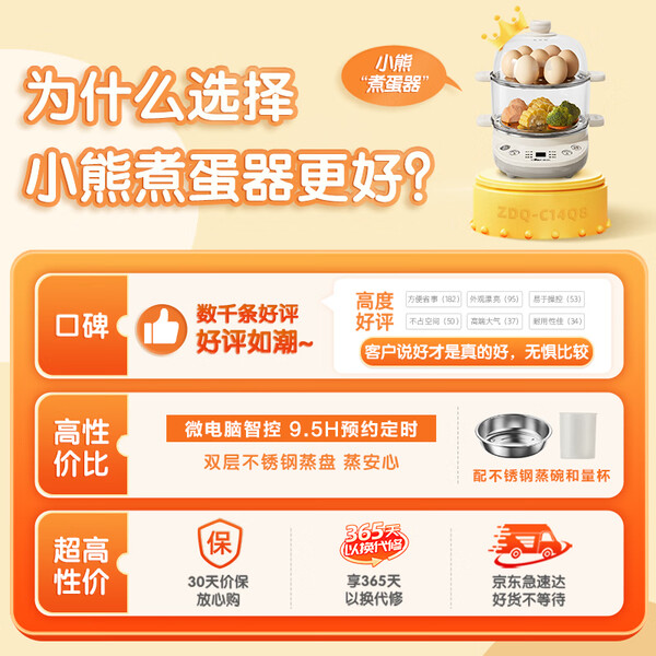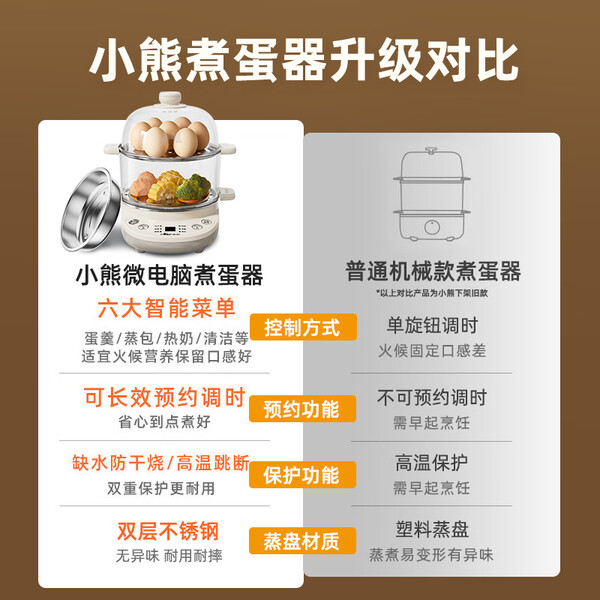 小熊(Bear)煮蛋器 蒸蛋器 9.5h智能预约 自动断电 家用不锈钢多功能ZDQ-B06N3 双层煮鸡蛋早餐神器