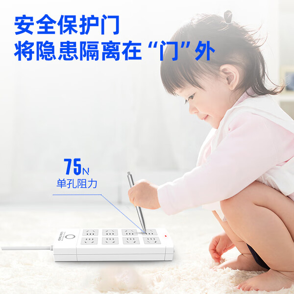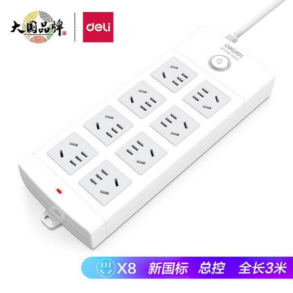 得力(deli)3C认证国标安全插座 插排/插线板/接线板/排插/拖线板 总控开关 儿童保护门 8组合孔3米 18211