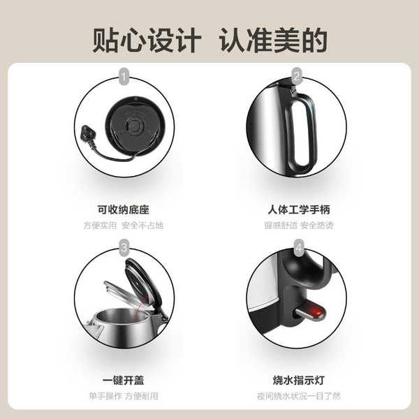 美的(Midea)电水壶电热水壶 大容量家用烧水壶 双层防烫开水壶 304不锈钢无缝内胆 大功率快速烧水 1.5L 【一键开盖I无缝内胆】HJ1566