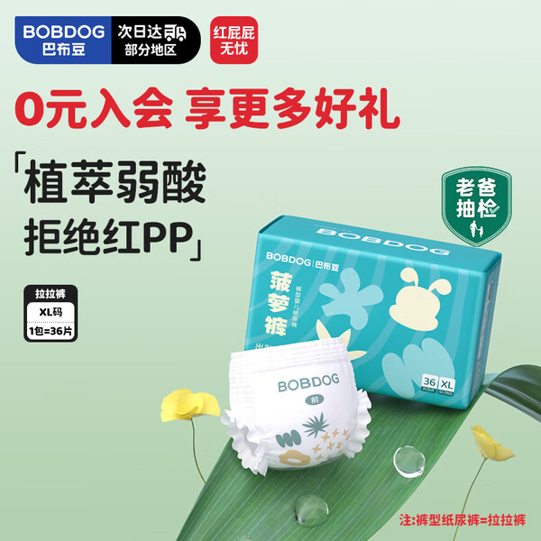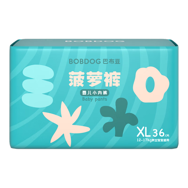 巴布豆纸尿裤是巴布豆(中国)儿童用品有限公司家族畅销产品之一,2012年巴布豆推出婴儿纸尿裤系列产品,以“给宝宝舒适的体验”为产品理念,在吸收性、干爽性、透气性、柔软性等各方面,综合提升了纸尿裤产品的舒适性。旗下系列比较丰富,有菠萝系列、飞帆系列、梦初语系列、超柔系列、特薄系列等,BoBDoG 巴布豆 菠萝系列 拉拉裤 XL36片,弱酸配方,贴近宝宝肌肤天然H值,帮助维持皮脂膜表面平衡值,保护屁屁健康,高分子魔力吸水珠,薄薄一片牢牢锁住7次尿量,超低返渗,阳光干爽。