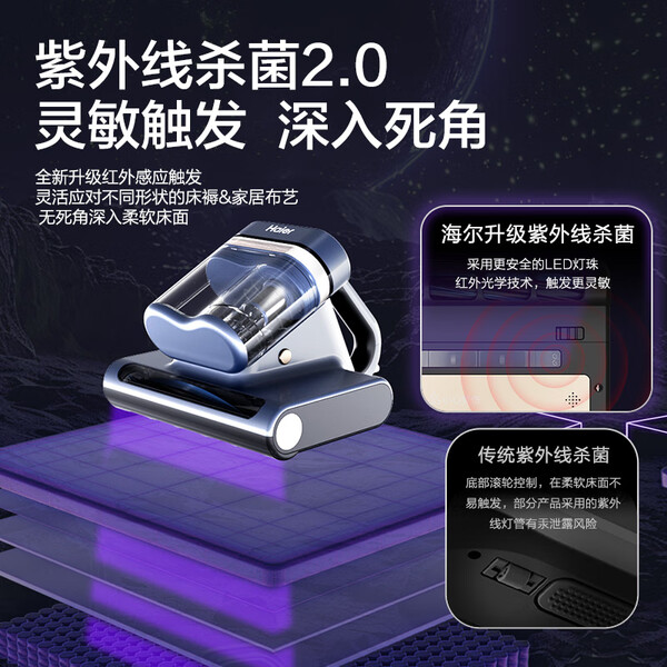 海尔(Haier)旗舰新品除螨仪家用床上双尘杯吸尘器一体机紫外线杀菌高频拍打大吸力超声波除去螨机虫沙发神器 【双动力双滚刷】灵境紫CGD3P