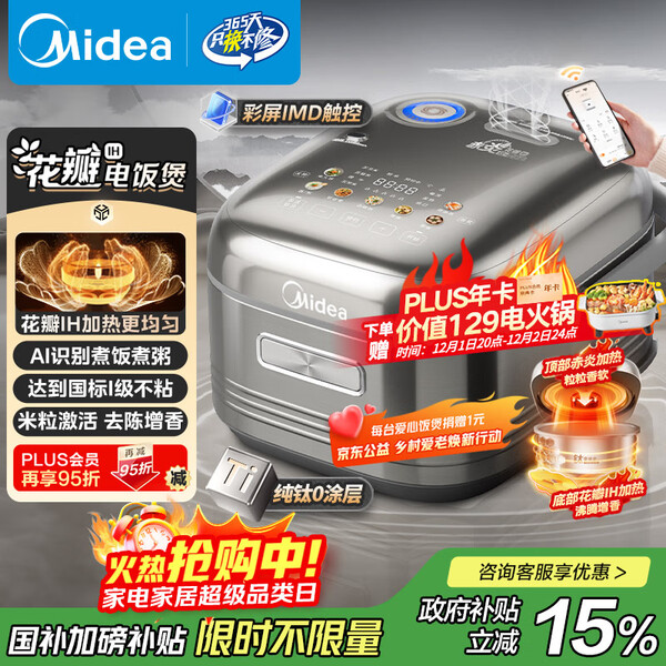 美的(Midea)【爱心饭煲】纯钛0涂层电饭锅防粘4L无涂层花瓣IH1.0电饭煲4-5人家用不锈钢智能多功能MB-HS412