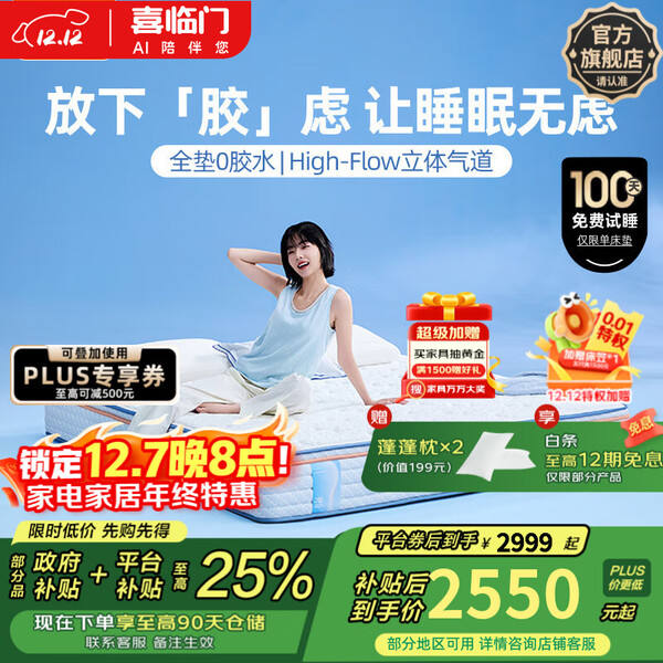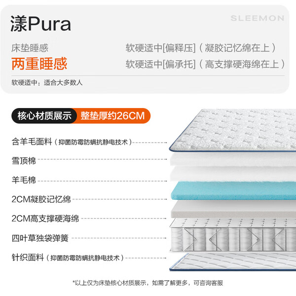 喜临门羊毛棉凝胶记忆棉7区独袋弹簧3D芯材床垫 漾pro1.8x2米 软硬适中