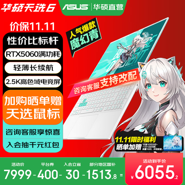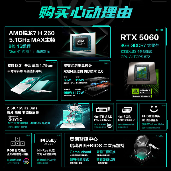 华硕天选6 政府补贴 16英寸游戏本 笔记本电脑 锐龙7 H260/RTX5060/魔幻青 16G内存/1T高速固态硬盘 2.5K 16:10高刷高亮高色域电竞屏