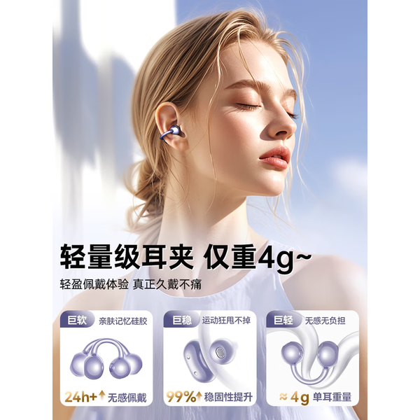 萨勒芬妮【OpenearClip华强北顶配款】蓝牙耳机耳夹开放式无线跑步运动通话降噪挂耳骨传导适用于华为 【流光紫】全景音效丨久戴舒适 超长续航丨超清通话丨AI降噪
