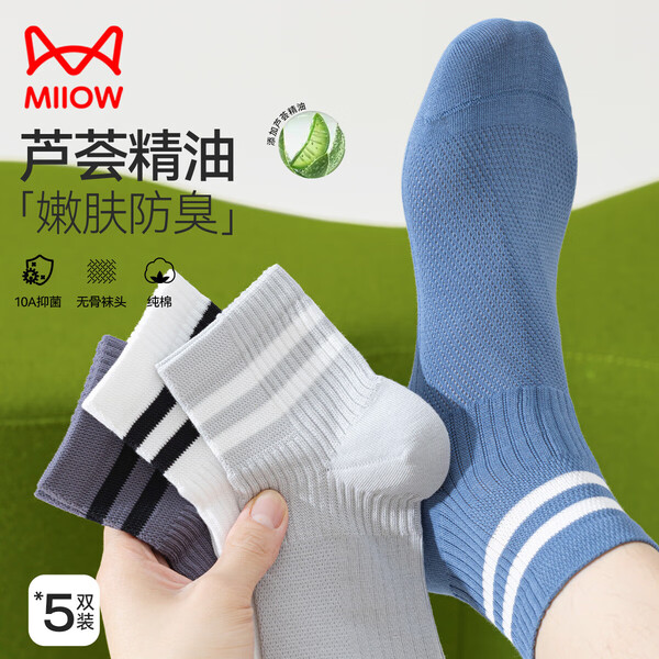 宜而爽袜子男中筒袜秋冬款男士运动袜拼色袜口长筒袜 【5双】黑色+蓝色+咖色+情色+浅灰 均码