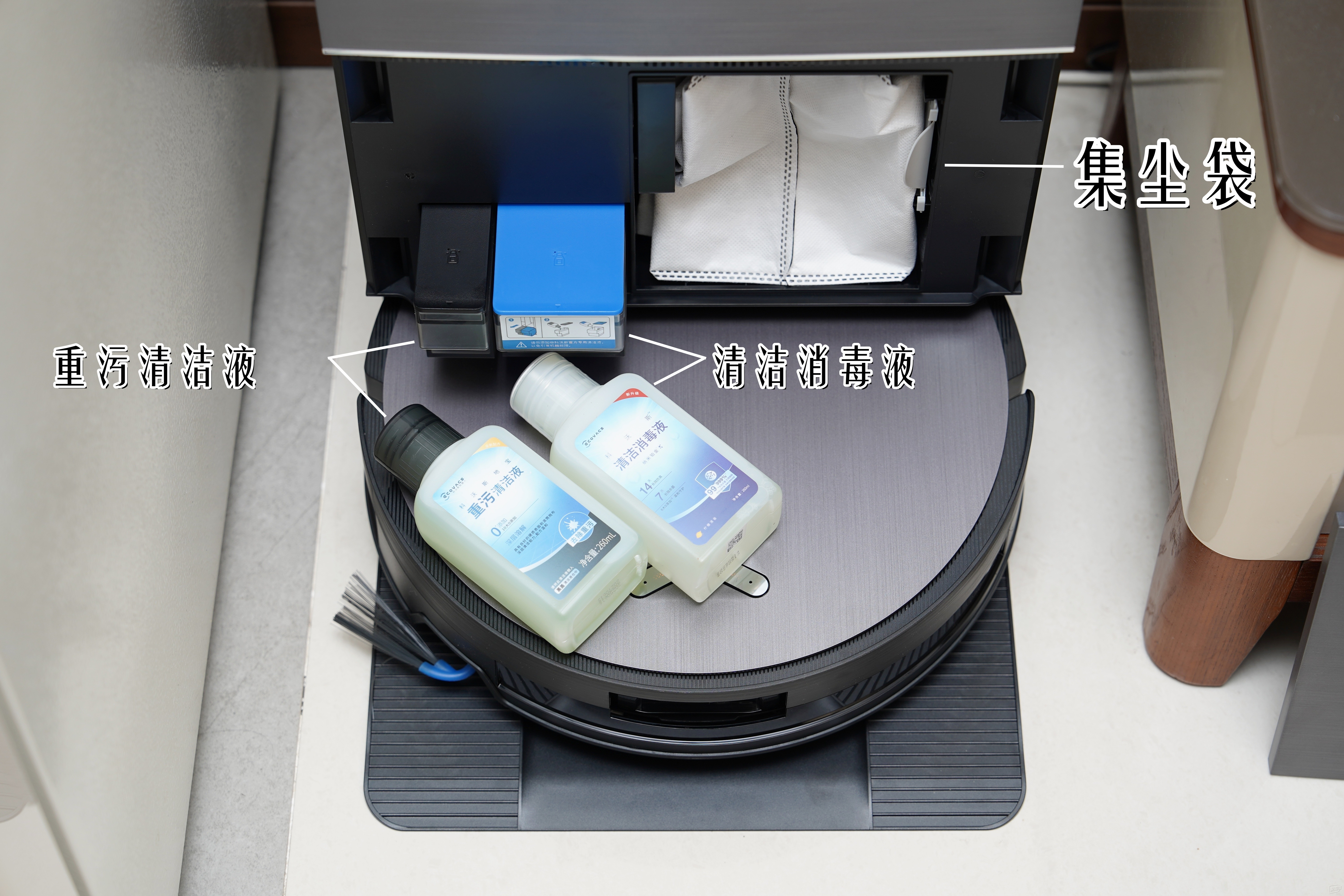 全能基站中集成了双效双仓清洁液,在拖地时可以自动投放清洁剂,在清洁厨房、餐厅重油污区域后,全能基站可以自动调用重油污清洁剂来清洗滚筒拖布。