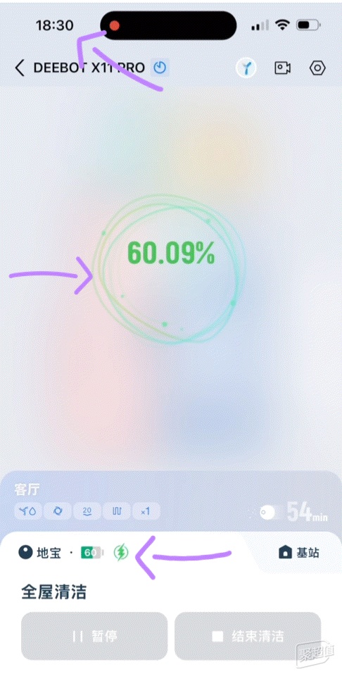 科沃斯X11 Pro在拖布回洗的时候,如果电量低于85%,就会触发它的瞬时超充,在回洗的3分钟短暂间隙,可以补充整机6%的电量。周末在家里做个极限测试,想看看这台扫地机器人到底可以支持多久、多大面积的连续扫拖工作。
