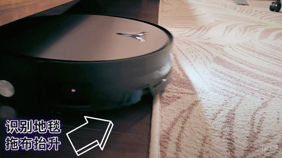 在执行边扫边拖任务时,超声波传感器感应到地毯之后,会自动抬升拖地组件,同时还会自动增压加强地毯吸力与风量,让地毯清洁更加透彻,拔出隐藏在短绒毛间的细小灰尘杂物。