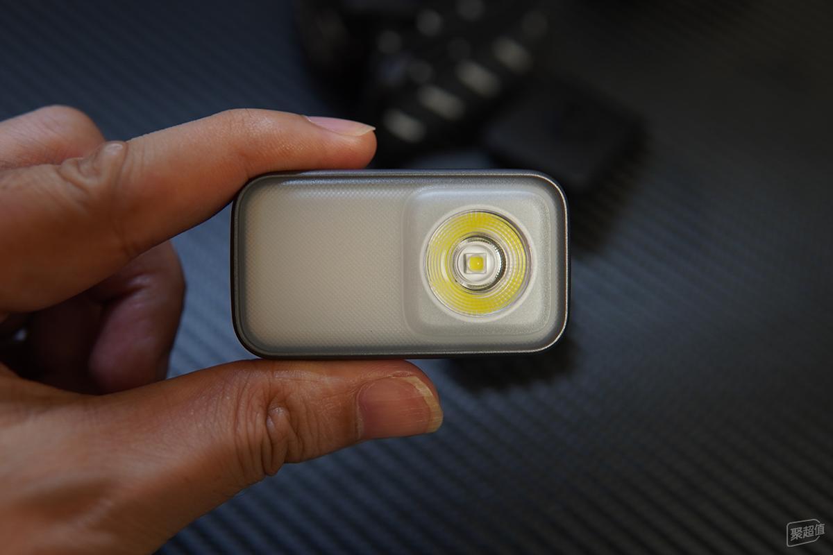 从正面能清晰看到配备的两种灯珠:全透明且能看到光杯的是聚光灯,它的最高亮度居然高达600流明,最远照射距离也达到了110米。真的不敢想象,这么小的一盏灯,竟然能达到这样的参数。