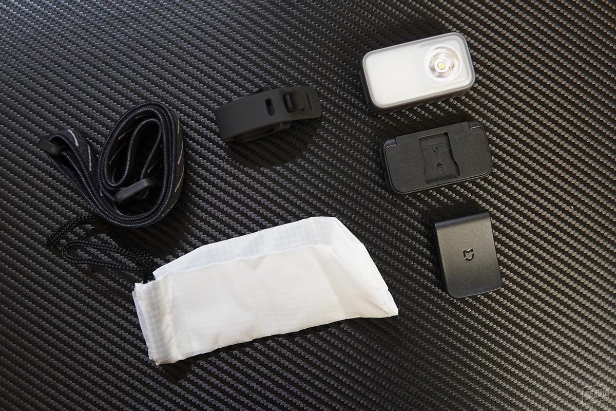 把配件全部拿出来,分别是多功能灯主体、骑行附件、帽夹、头灯带、便携收纳袋。这个收纳袋除了收纳,还能兼做露营灯配件,我会在文章后半段展示这一点。