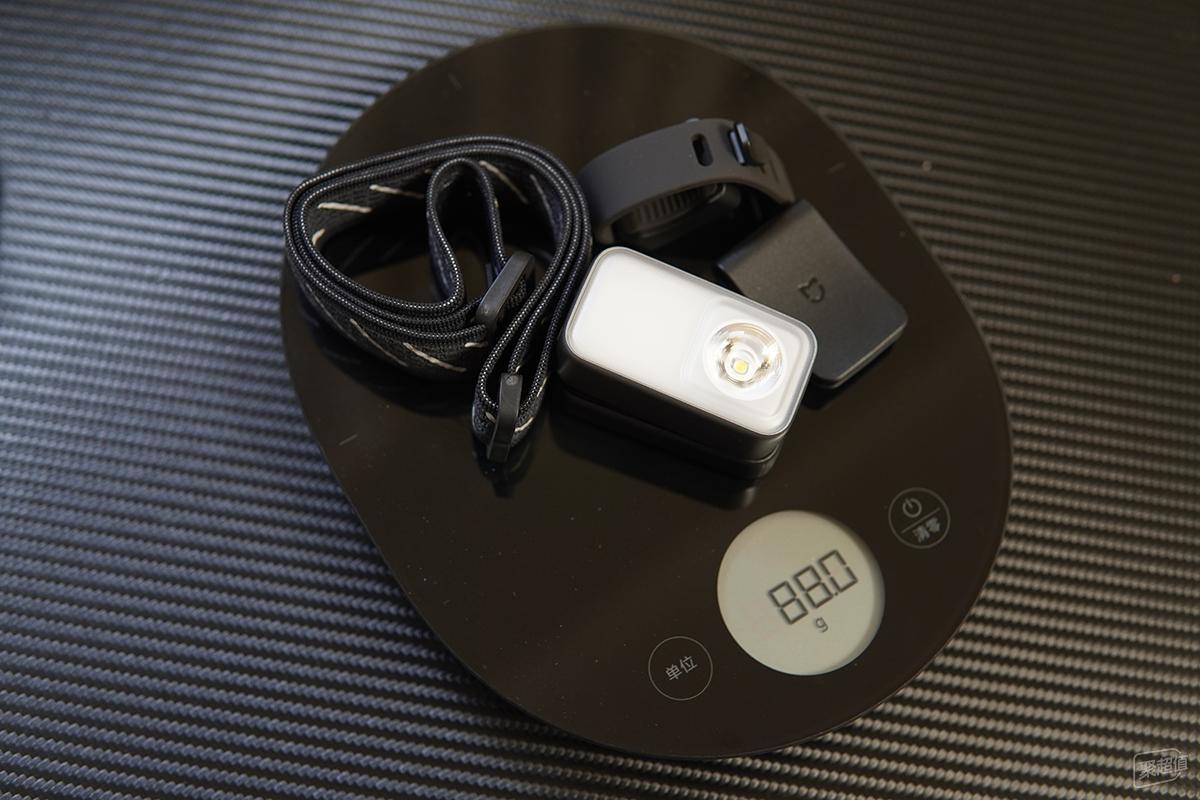 这户外多功能灯到底有多小、多轻便?我把这一堆配件加主灯全部称重,总重量也只有88克。不管是戴在头上、固定在帽子上,还是夹在自行车上,都绝不会有累赘感,因为它真的:轻到无感!