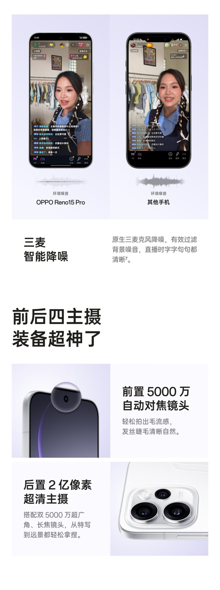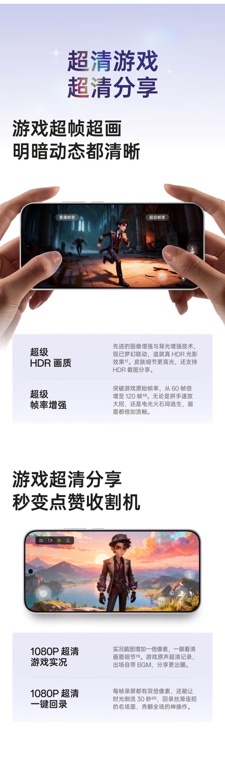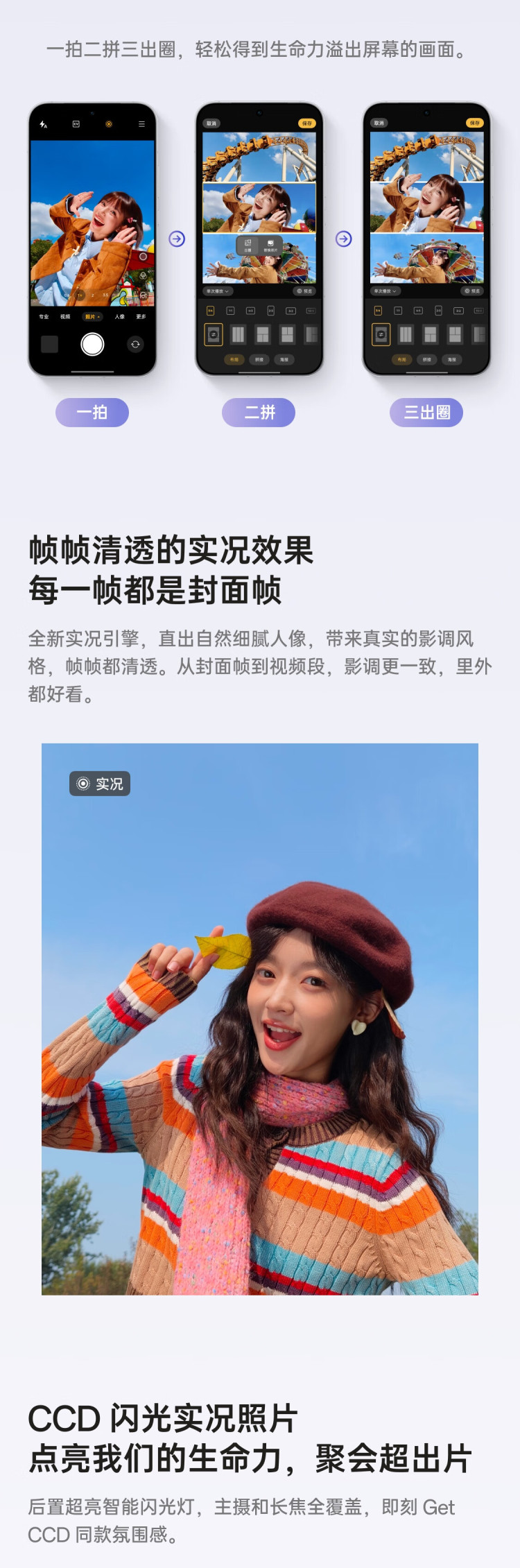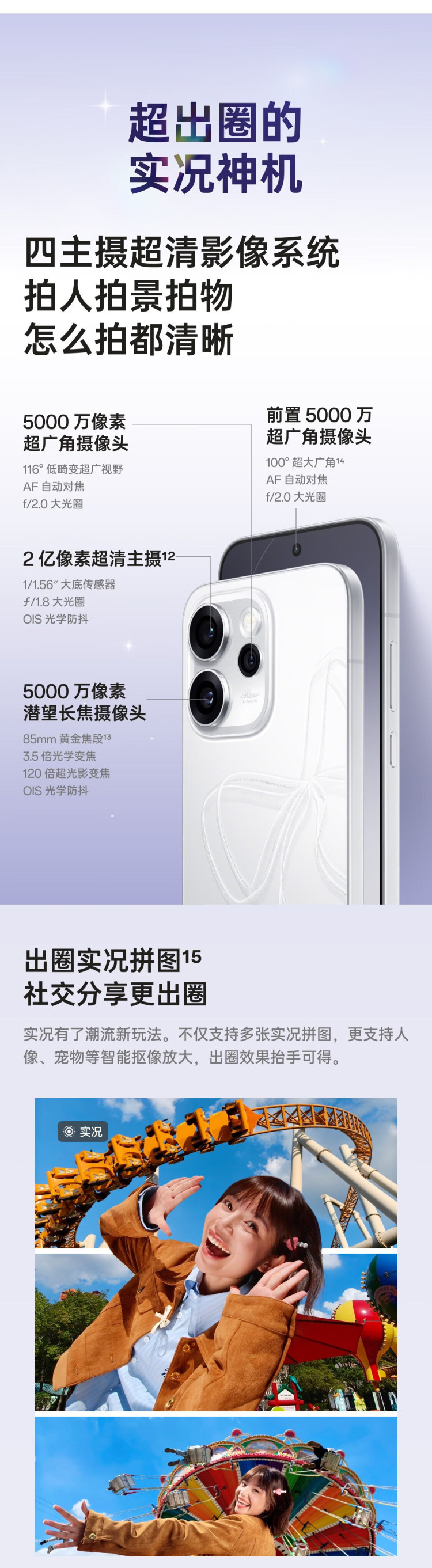 | 拍摄功能描述 | 【后置摄像头】 照片,视频,人像,夜景,全景,电影,慢动作,多景录像,延时摄影,萌拍,高像素,水下相机,AI 证件照,专业模式,超级文本,扫一扫 【前置摄像头】 照片,视频,人像,夜景,全景,多景录像,延时摄影,萌拍,美颜自拍,屏幕补光,高像素,AI 证件照 |