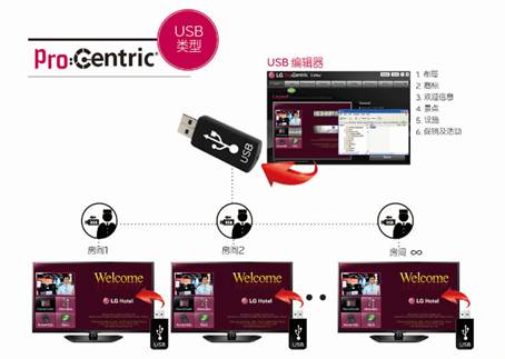 为了实现有效的酒店电视内容管理,LGLP560H提供的Pro:Centric?USB应用程序可以帮助酒店简单快捷的实现可增值的电视服务。LGPro:Centric?是专门为酒店开发的信息发布平台及客房电视远程管理平台,拥有着优于行业同类解决方案的可靠性和创新性。它通过一个USB驱动器来完成匹配服务的酒店信息的修改,不需要额外的服务器或机顶盒,只需要简单4步便可完成管理者的内容创建,实现所有电视显示信息的远程同步管理。这不仅为酒店节省了可观的运营成本,同时为住户营造更好的入住氛围,顾客能轻松享受到便捷信息发布所带来的便利。