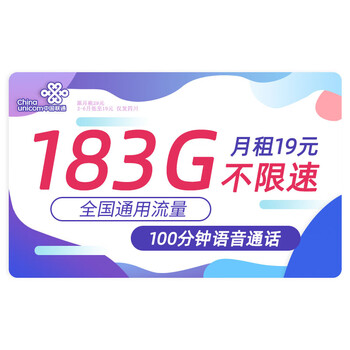 China unicom 中国联通 锦川卡 19元月租(183G通用流量+100分钟通话)红包30元